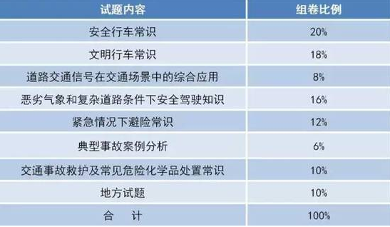 駕考新規(guī):20%安全行車常識(shí);18%文明行車常識(shí);8%道路交通信號(hào)在交通場(chǎng)景中的綜合應(yīng)用;16%惡劣氣象和復(fù)雜道路條件下安全駕駛常識(shí);12%緊急情況下避險(xiǎn)常識(shí);6%典型事故案例分析;10%交通事故救護(hù)及常見危險(xiǎn)化學(xué)品處置常識(shí);10%地方試題。